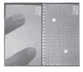 实际电极设计中,每对感应单元设计为多组电极,并根据Lens的厚度设计电极面积以及间隙大小。间隙过大会导致线缝可见,因此使用假电极进行填充使线缝在30μm以内则可以避免上述问题。经过实际测试,在实现单点触控基本功能的同时,能够实现两点触控,满足设计要求。操作效果如图5所示。
