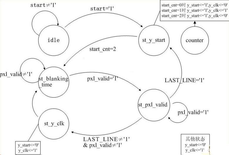 CMOS图像传感器结构简单,内部集成度高,因此仅需很少的外部控制信号即可完成视频图像的采集输出。系统工作过程如下:当系统上电后,CPLD产生复位信号复位整个芯片到初始状态,然后对芯片进行并行数据注入,向CMOS图像传感器的特殊寄存器写入预定值,设置诸如像元积分时间,像素读出行数,输出放大器增益等参数。随后CPLD给CMOS芯片提供 ss_start信号,标志开始像素积分,ss_stop信号结束像素积分,随后图像传感器即处于可读出状态。向CMOS发出y_start信号开始一帧图像的读出,发出y_clock信号,开始一行图像的读出,当CMOS图像传感器有像素信号输出时, pxl_valid引脚信号为高,此时CMOS图像传感器正在进行一行图像的输出,当pxl_valid变低时,一行图像输出结束,CPLD再提供下一个y_clock信号,启动CMOS进行下一行图像的读出。当一帧图像的最后一行开始读出时,CMOS芯片的LAST_LINE引脚变高,标志一帧图像读出的结束,CPLD再产生下一个ss_start信号,开始下一帧图像的读出。这样,CMOS就在CPLD的时序控制下,正常工作,循环读出图像。