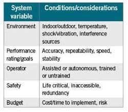 MEMS惯性传感器可靠度高(汽车行业20年的应用历史证明了这一点),它在手机和视频游戏中的成功应用说明它在商业上极具吸引力。然而,不同应用对性能的要求大不相同,适合游戏的器件并不能解决本文所述的高性能导航问题。对于导航,重要的MEMS性能指标是偏置漂移、振动影响、灵敏度和噪声。精密工业和医疗导航所需的性能水平通常比消费电子设备所用MEMS传感器的性能水平高出一个数量级。表3列出了有助于传感器选型的一般系统考虑。