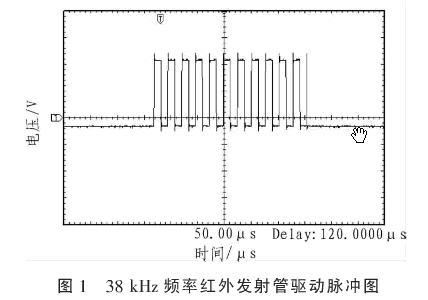 发射管选取SIR204-A型发射管,该红外线二极管驱动电流范嗣为20~100 mA,其正向导通压降为1.3~1.5 V,发出红外线光波长范围约为835~930 nm,发射角度为30°,直射时红外线光强度最大。发射管驱动电压采用脉冲电压,38 kHz载波频率,发送时长为280 μs,占空比为1/2的方波,发送间隔为720 μs。载波脉冲需要与红外线接收管的型号相匹配。红外发射管能够匹配光电晶体管、光敏二极管和红外接收器???,红外传感器的接收部分选择了带有放大和滤波功能的红外线接收二极管。发射部分的设计需要考虑到接收部分的制约。经过验证调制脉冲驱动电流能够匹配红外线接收管,将红外线接收管导通。驱动发射管PWM的波形如图1所示。