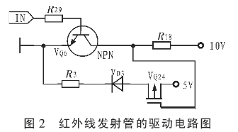 图2是红外线发射管的驱动电路图。脉冲信号由R29处输入,通过NPN型三极管,从而控制红外发射管VD3的通断情况,本电路中单个红外管驱动电流选择值约为20 mA。由于NPN型三极管驱动电流低于20 mA,需在电路中加入P-mos管增强驱动能力。R18和R29的电阻值需要匹配,若2个电阻匹配不佳,会造成驱动脉冲波形毛刺较多,使二极管导通能力减弱,导通时间延迟增大。R18尽量大,能够减少电路功耗,R18和R29都选用10 kΩ电阻。红外线发射管的驱动不稳定,会造成接收判断失效,驱动电路的配置要根据实验进行匹配。