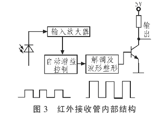 红外线接收管内部电路如图3所示,红外线接收二极管内部电路将导通后微弱脉冲信号放大、滤波整形,输出单片机可以识别的方波脉冲信号。该类型红外线接收管导通波长范围约为850~1 050 nm,红外线发射管发射波长约为875 nm,能够满足红外线接收管导通要求。