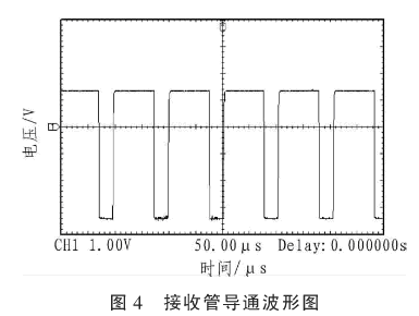 红外线接收管选用HS0038型的红外一体接收头,该器件集成度高,能够以小成本实现图3所示功能。红外线接收管需要接收38 kHz左右带宽的脉冲波形,接收发射管只能接收间歇发射的红外线,发射红外线过于密集,接收管无法导通,需要予以注意。红外线发射管发出38 kHz载波,将红外线接收管导通。该波形频率为1 kHz,周期内高电平时间720μs,低电平时间280μs。当有物体遮挡红外线对射管时,发射源被遮挡,红外线接收管无法导通,输出高电平。由此可以判断是否有物体从红外线对射管中间通过。红外线接收管导通时的输出波形如图4所示。