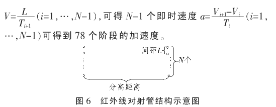 红外线对射管构成一对红外传感器收发子单元。若干对红外传感器收发子单元构成完整的红外线测速传感器,其红外线对射管分离距离和红外传感器收发子单元间距可以调整。如图6所示,Ⅳ需要大于2,分离距离超过5 m。在两对红外线对射管之间测量物体经过的时间T,间距设置为L,可以得到后一对红外线对射管的即时速度V:
