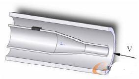 作者所在的研究组在前期应用压力梯度法和压力互相关法测量液压系统流量进行了理论和实验研究,取得了一定进展,在此基础上,提出这种不需要引压,直接让 MEMS敏感芯体在管内获得与流量对应的差压信号的新方法。相比之下新方法在对系统较低扰动的前提下更易获得较高的信号水平,精度能满足一般液压系统,具有高的动态测量频宽。其机理是利用内置于管道中特殊设计的异径结构装置,如图1所示,对内外流体分别产生收缩和扩压双效作用,获得低压损、低能耗的微小压力差,通过置于上面的MEMS敏感芯体测取,并根据建立的压差-流量关系模型,及仿真手段和实验测试得出该状态下的流量值。