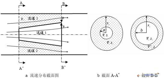 如图2所示,流体在异径管内外被分为流道1和流道2,在这里,r0为管路半径,a、b分别为内流道入口和出口处半径,忽略异径管厚度,因此a、b也是外流道的进出口处内径,假设从截面A-A*到截面B-B*流线不发生增加或者减少,即任何A-A*面上一微元ds都可以沿着流线找到在B-B*面上的映射 ds*,则在流道1内任一流线上有: