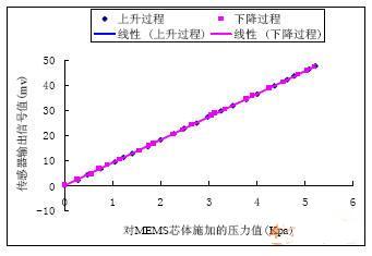 由图可以看出,在额定工作压力量程范围内,芯体所受的压差与输出信号呈良好的线性关系,传感器输出信号随压力上升和下降过程中线性重合度非常好。多次标定结果显示传感器有良好的重复性,这为以后实验数据的可靠性提供了有力保障,同时也说明所选压阻式MEMS微型压差敏感芯体的性能满足实验要求。