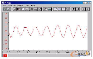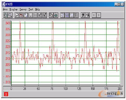 在动态试验中,保持液压泵提供20L/min的工作流量,使用Wavebook512信号系统对MEMS传感器输出流量信号进行采集,如图7所示。尽管受到系统内阀口、管路等造成的干扰,而且由于柱塞泵各柱塞在制造、安装以及使用中产生的误差和磨损造成的不均匀现象,导致流量波动曲线有些变形,但是还是可以很清晰的看出流量的波动周期约为60ms,即频率16.7Hz。由于电动机工作在50Hz频率,额定转速1000r/min,因此相应的轴向柱塞泵运转频率也是1000/60=16.7Hz,这正与上面的测量结果吻合。
