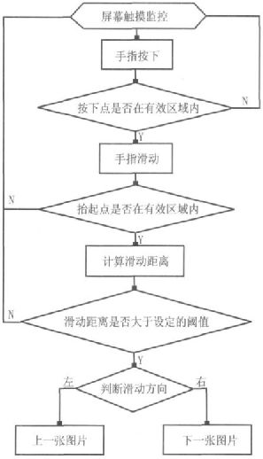 当手指按下时,首先判断按下点的坐标是否在设定的有效区域内,再判断抬起点的坐标是否在设定的有效区域内。当手指按下点和抬起点都在有效范围内时,计算滑动距离,若滑动距离小于设定阈值,当作是无效触摸,不做任何处理。滑动距离大于设定的阈值且向左滑动,切换为上一张图片;滑动距离大于设定的阈值且向右滑动,切换为下一张图片。