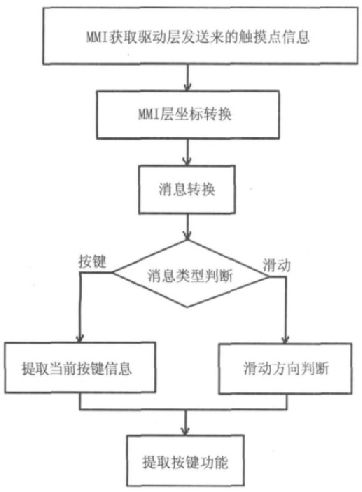 如图6 所示,在获得触摸点消息后,系统MMI 层调用MMI 层坐标转换函数提取驱动层发送的触摸点位置信息,并转化为MMI 层的位置信息。当有触摸操作进行时,底层驱动程序向MMI 层发送触摸点的位置信息。在获得驱动层触摸点信息后,系统MMI 层调用MMI 层坐标转换函数提取驱动层发送的触摸点位置信息,并转化为MMI 层的位置信息。如果系统所发事件是按下事件(MMI_PEN_EVENT_DOWN),系统根据触摸点坐标调用当前按键信息提取函数获得被选按键信息;如果是滑动事件(MMI_PEN_EVENT_MOVE),则进行滑动方向判断。