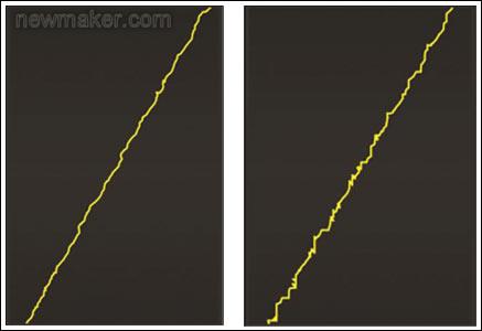 图3. 一个机器臂握着4mm金属片画的直线。左侧使用的是高SNR的触摸屏控制器;右侧使用的是低SNR触摸屏控制器