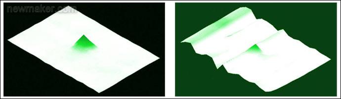 图4. 4英寸屏上使用2mm导电书写笔的电容值剖面图,左侧剖面使用高SNR触摸屏控制器;右侧使用低SNR触摸屏控制器。书写笔位于绿色锥体顶部;白色平面的 高度代表了背景噪声。信噪比的增加有效降低了背景噪声幅度,如左图所示。如果右图中的书写笔移到屏幕的左边,信号将被噪声淹没,书写笔将无法工作。