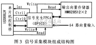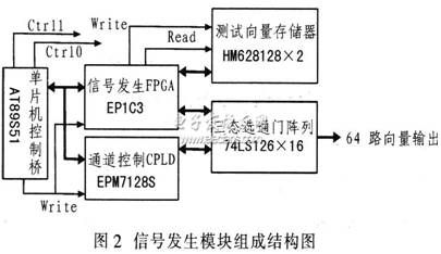 该??橛傻テ刂魄?AT89S51)、测试向量存储器(静态存储器HM628128x2,排列方式为256 Kx8 bit)、信号发生FPGA(Altera公司Cyclone系列PLD器件EP1C3)、通道控制CPLD(Altera公司MAX7000系列PLD器件EPM7128S)及三态选通门阵列(74LS126x16)组成,模块组成结构如图2所示。