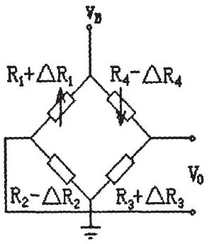 其输出电压表示为vo=KAR/R(Rl=如=R3=R4,△R1=△R3=△R2=△R4)。