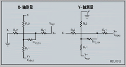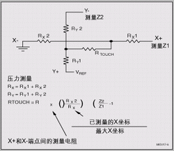 四线和八线触摸屏可以测量出接触电阻,即图5中的RTOUCH。RTOUCH与触摸压力近似成正比。要测量触摸压力,需要知道触摸屏中一层或两层的电阻。图6中的公式给出了计算方法。需要注意的是,如果Z1的测量值接近或等于0(在测量过程中当触摸点靠近接地的X总线时),计算将出现一些问题,通过采用弱上拉方法可以有效改善这个问题。