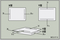 为了在电阻式触摸屏上的特定方向测量一个坐标,需要对一个阻性层进行偏置:将它的一边接VREF,另一边接地。同时,将未偏置的那一层连接到一个ADC的高阻抗输入端。当触摸屏上的压力足够大,使两层之间发生接触时,电阻性表面被分隔为两个电阻。它们的阻值与触摸点到偏置边缘的距离成正比。触摸点与接地边之间的电阻相当于分压器中下面的那个电阻。因此,在未偏置层上测得的电压与触摸点到接地边之间的距离成正比。