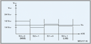 图2显示了一个4位转换过程的例子,图中Y轴和粗线表示DAC的输出电压。