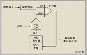 该结构将模拟输入电压(VIN)保存在一个跟踪/保持器中,N位寄存器被设置为中间值(即100.。.0,其中最高位被设置为1),以执行二进制查找算法。因此,数模转换器(DAC)的输出(VDAC)为VREF的二分之一,这里VREF为ADC的参考电压。之后,再执行一个比较操作,以决定VIN小于还是大于VDAC:
