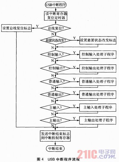 因为C8051F321的USB模块高度集成化,所以对USB接口的设计主要是USB固件程序的设计。其中最重要的是USB描述符和USB传输中断的处理。当USB中断到达时,C8051F321首先读取3个中断寄存器(CMINT、IN1INT和OUT1INT)来判断中断来源(USB复位中断、端点0中断、端点1输入中断、端点2输出中断),然后跳入相应的处理??榻写?。USB中断程序流程如图4所示。