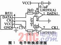 由于容栅传感器内部的专用控制芯片输出的信号电压为1.5 V,而后续数据采集系统工作电压为5 V,要进行数据交换则必须进行电平转换,电平转换原理图如图1所示。电路中采用LM393芯片转换电压,LM393芯片实质上为2个比较器,比较电压为容栅传感器工作电压的一半左右,设为0.6V。通过比较电压0.6V与CK和DATA信号线电平比较,即可将CK、DATA信号线的电压转换为0V或者5V。