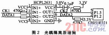 由于系统经常工作在工业现场等领域,各种电磁干扰很常见,为了使系统能稳定工作,采用光耦隔离技术将传感器和单片机隔离。光耦隔离原理图如图2所示。光耦器件采用HCPL2631高速光耦,输出引脚OUT1和OUT2经过上拉电阻处理后,将CK2和DATA2信号传输给C8051F321单片机处理。