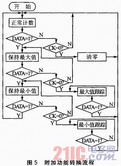 附加功能子程序包括正常计数、数据保持、最大值跟踪、最小值跟踪和清零的功能。对附加功能的实现均是通过控制CK和DATA信号线完成,附加功能转换流程如图5所示。给CK信号线一个负脉冲,即可完成清零操作;在正常计数状态下将DATA信号线置为高电平,容栅传感器将进入保数功能;如果再将CK信号线置为低电平,容栅传感器进入最大值跟踪功能;内部专用芯片将用新测得的数据与上一个数据进行比较,如果新测得数据大,则替换掉,否则丢弃。可以在上位机上通过USB测试软件发送相关命令来控制系统进行操作。程序中设定一个字节的变量来存放从上位机接收到的命令,当判断是其中的一个命令时就调用相应的处理程序完成操作。