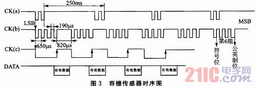 容栅传感器时序图如图3所示。其中包含3个CK信号说明和1个DATA信号说明。CK(a)表示要发送的完整数据间的时序关系;CK(b)表示一个完整数据内部各个数据组的时序关系;CK(c)和DATA表示一个数据组内的时序关系和对采样点的说明。由图可知数据每隔250 ms发送一次,在时钟CK的上升沿数据有效。数据由LSB到MSB依次发送,总共24位二进制数据,分成6组,每组数据间隔820μs。其中前5组为数据位,第6组为控制位组(包含符号位和公英制位),控制位组的第0位的“0”表示正数,“1”表示负数,第3位“0”表示公制单位mm,最小单位0.01 mm,“1”表示英制单位inch,最小单位0.000 5 inch,x表示无效。为了能够实时采集数据,采用中断方式检测CK信号,边沿触发。检测CK信号的高电平持续超过820μs时,当出现下降沿时触发中断,进入中断程序,再持续检测低电平直到出现上升沿,读取DATA信号电平并存储,总共采集24位。返回主函数根据符号位和公英制位进行相应处理。相关程序代码如下: