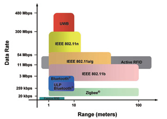 根据不同的频率、目标数据速率、距离,以及互操作性的理想水平,新出现了几种工作在ISM频率空间中的标准。图1显示了无线工程师进行产品开发时最常使用的一些标准。