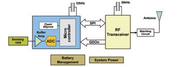 每个无线传感器都被看作一个节点,拥有无线通信能力,同时还具有一定的信号处理与网络数据的智能。根据应用的类型,每个节点都可以有一个指定的地址。图2显示了某个节点的通用结构图。它一般会包括一个传感装置、一个数据处理微控制器,以及一个无线连接RF??椤8莶煌耐缍ㄒ?,RF模块可以起到一个简单发射器或者收发器 (TX/RX)的作用。进行节点设计时,注意电流消耗和处理能力非常的重要。微控制器的内存非常依赖于所使用的软件栈。