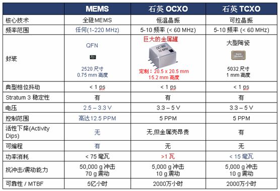 图4:MEMS三级钟和传统OCXO和TCXO三级钟的比较