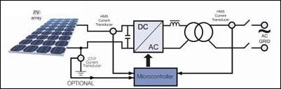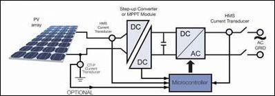 通常在刚好在PV 方阵后使用最大功率点跟踪(MPPT)组件来确保方阵工作在其最大功率运行水平。通过使用用于跟踪功能的电流和电压传感器,应用一种特殊软件算法和专用电子元件一起来控制电池板(电池)的工作点。一般来说,一台电流传感器可用于测量单相输出(供到电网的电流),而另一台传感器可用于测量输入直流电流(10-25A)。在三相输出的情况下,两台传感器可用于测量三相输出的交流电流。接入电网的DC/AC逆变器是一台将直流信号转换为正弦波的全桥逆变器。