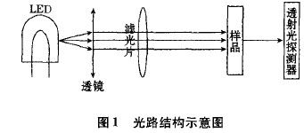 系统要求光电传感探测部分具有较高的检测精度和稳定性,且实时性高,即需要对待测海水进行连续不间断的在线测量,因此采用近红外LED作为光源。光源发出的近红外光经过光学镜组选择得到对溢油具有特征吸收的分析光,经透射与样品室的样品发生相互作用,然后进入光电探测器,将光信号转换为电信号,从而实现对样品成分的检测见图1所示。