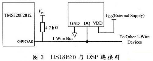 DSl8B20与DSP连接主要有两种方式:寄生电源方式和外部供电方式。本文采用外部供电方式,其中18B20的DQ口与F2812的GPIOA0口连接,具体连接如图3所示。