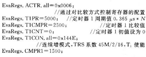 TMS320的事件管理??樽芄材苁涑?6路PWM信号,文中仅需要输出一路占空比可调的PWM信号,并设计从PWMl引脚输出该方波信号。文中选用通用定时器1(T1)作为时基;全比较单元1保存调制值;计数方式采用连续增计数模式。PWM占空比值与T1的三角波数据比较,输出PWM信号控制半导体制冷片工作。各寄存器设置如下(高速外设时钟为22.5 MHz):