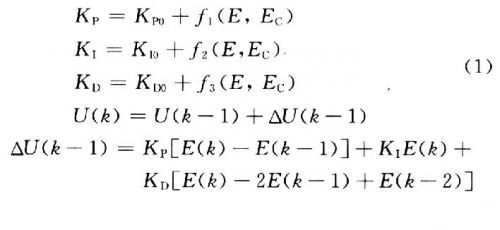根据前面叙述,用DSl8B20读取温度采样值,再通过参数自整定的Fuzzy-PID算法对数据进行处理:根据E和Ec的状况,由模糊控制规律再通过模糊表推导出△KP,KI,KD,根据式(1)计算出KP,KI,KD的大小,再计算出U的初值和△U,由式(2)实时计算控制量U。通过参数转换,将U转换为PWM参数,修改EvaRegs.CMPRl的数值,改变PWM的占空比,从而控制TEC的制冷/制热功率。