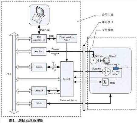 目前,汽车传感器没有一个统一的行业标准,基本是按照使用者的要求定制。譬如目标轮及其转速、空气气隙和传感器的安装尺寸各不相同,即使是传感器装配到同一种车型上,也会随着安装位置的不同而存在差异。但是,同一台设备不可能满足全部传感器的测试要求,由此引入??榛纳杓扑枷?,即系统中相同的部分,如测试仪器、测试软件、气动控制系统、主电路系统,作为公用资源(这里称为“主机”);对系统中要求随着传感器变化的部分,如目标轮及马达、夹具及专用电路,被看成模块。主机和??橹洳捎每觳宓姆绞酵瓿傻缙忧椅曜蓟涌?,可进行后续扩展。当测试不同传感器时,选用不同的测试模块连接到主机上即可。