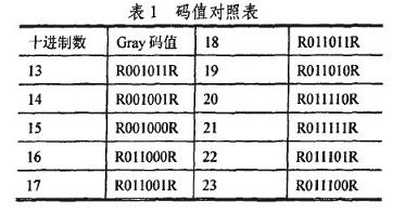 编码采用格雷码(Gray)为数值码,以某一固定码宽为参考码R,它用于标尺定位和提高精度。Gray码是一种绝对编码方式的无权码,它所具有的循环、单步特性能消除随机取数时出现重大误差的可能,其任意两个柏邻整数之间转换时,只有一个位数发生变化,大大减少了由一个状态转到下一个状态时的逻辑混淆,具有较强的容错能力。以6位编码为例,其部分十进制数与Gray码的一一对应关系如表1所示。
