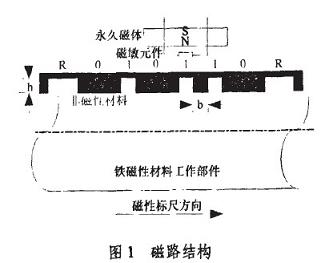 采用图1所示的测量结构,其中被测工作部件要求属于铁磁性材料。文献中指出在固定的磁场中,表面变化的曲率越大,引起的周围磁场,变化也越大。为了使磁场的影响最大,选用凹槽作为测罩标志,以单位宽度(bmm)的凹槽表示“0”或码元间隔,单能宽度的“凸槽”表示“1”,两倍单位宽度的“凸槽”表示标志位R。在工作部件表面,按上述的编码规则加下出一系列凹槽,然后喷涂上非磁性材料,形成磁性标尺。图1所示的磁性标尺表示Gray码01 1010码区,黑色部分表示非磁性材料。