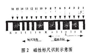 根据磁敏传感原理,“凹槽”和“凸槽“会导致不同的磁场强度,从而使磁敏元件相应地输出不同的电半信号“0”或“1”,形成数值码,用于确定位移的粗读值;而标志位R码宽两倍于码元“1”宽度的特点,使得识别后的序列出现具有固定特征的标识码,它用于精读数。