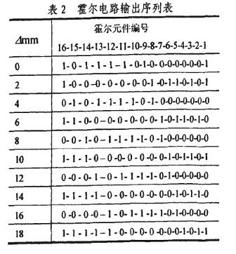 霍尔电路的工作原理是,在外磁场的作用下,当磁感应强度B超过导通工作点时,霍尔电路输出管导通,输出低电-半:若曰值低于释放点时,输出管截止,输出高电半。因此在“凸槽”时钢质活塞杆被磁化,磁感应强度曰增加,霍尔电路导通,输出低电平,用“1”表示;在“凹槽”时输出高电平,用“0”表示。以第1个霍尔元件为测量基准,从图2所示时刻起,位移晕旃次变化b=2mm时,一个码区行程内霍尔电路输出的二进制序列如表2所示。分析可知,序列的标识码为l 0000000 1,其前面或后面6位序列数分别为相邻的两个数值码,这使它具有很强的容错能力。标识码每隔一个霍尔元件间距N在低位部分右移一位。值得注意的是,标识码前面的数值码代表磁性标尺当前检测位置下一个码区的值。