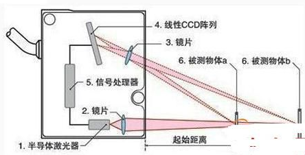 激光发射器通过镜头将可见红色激光射向物体表面,经物体反射的激光通过接受器镜头,被内部的CCD线性相机接受,根据不同的距离,CCD线性相机可以在不同的角度下“看见”这个光点。根据这个角度即知的激光和相机之间的距离,数字信号处理器就能计算出传感器和被测物之间的距离。