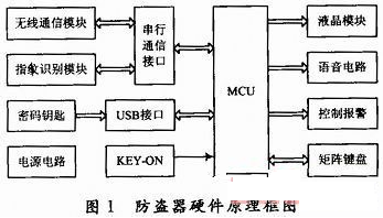 主要工作原理如下:车主停车熄火后,防盗器进入锁定状态。此时如果汽车钥匙不在ON位,就不能进行指纹识别;只有当汽车钥匙在ON位,才可用指纹识别解锁防盗器并自动点火。在锁定状态下,汽车的油路、电路等被切断,汽车钥匙无法点火;如果强行剪断指纹采集??楹涂刂坪械牧?,或者不识别指纹而强行用汽车钥匙点火,汽车会通过鸣号、闪灯和无线通信网络报警。在锁定状态插入密码钥匙可进入解锁状态,并可根据LCD和语音提示通过小键盘进行指纹注册/删除、手机号码设置和应急点火等操作。