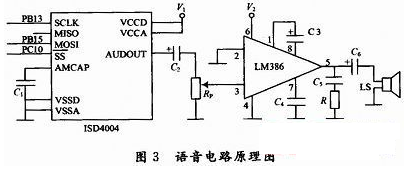 语音电路原理图如图3所示,由美国ISD公司的语音芯片ISD4004-16和美国国家半导体公司的音频功率放大器LM386等元件构成。ISD4004 -16录放时间为16 min(可分段),它采用CMOS技术,单电源3 V工作,内含振荡器、抗混叠滤波器、平滑滤波器、音频放大器、自动静噪及高密度多电平闪烁存贮陈列。它内置微控制器SPI总线串行通信接口??山D庥镆羰葜苯有慈氲ジ龃娲⒌ピ?,不需通过A/D或D/A转换。使得ISD语音电路具有音质自然、使用方便、单片存储、反复录放、低功耗、抗断电等许多优点。LM386工作电压范围宽,电压增益可调。具有自身功耗低、电压增益可调整电源电压范围大、外接元件少和总谐波失真小等特点。本设计中STM32F103VC通过SPI2给ISD4004传送语音信息。图3中的V1和V2分别经三极管与+3.3 V和+12 V电源相连,三极管的通断由STM32F103VC的PCI1和PCI2控制,只有在需要语音提示时,才使三极管导通给ISD4004和LM386供电。