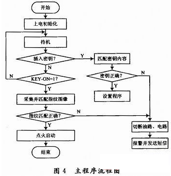 在锁定状态,车主要进行指纹注册/删除或应急点火时,接入密码钥匙,通过键盘操作STM32F103VC在其PA1产生CH376T芯片的SPI片选信号,低电平有效,然后按SPI输出方式发出一个字节的数据,延时1.5μs,从CH376T接收一个字节的数据,等待SPI接口空闲后,MCU继续从CH376T接收数据,直到MCU禁止SPI片选。接下来对读取的数据进行密码匹配,密码匹配正确时可进入设置状态,车主可根据语音和LCD提示进行操作,操作结束便返回锁定状态。如果密码匹配不正确将发出相应报警信号并切断电路和油路。如果不进行设置,当插入汽车钥匙并打至“ON”位,可进行指纹采集和匹配,匹配正确可自动点火(点火失败时可用车钥匙再次点火),如果指纹匹配不正确,发出相应报警并保持电路和油路为断开状态。