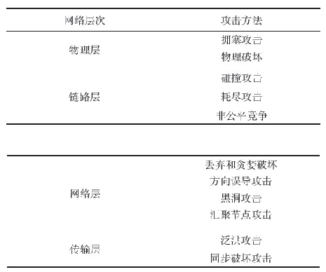 无线传感器网络(WSN)易受各种安全威胁,许多文献匀有描述。文献将WSN的攻击按照不同层次分类,如表1所示。