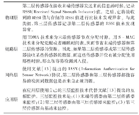 修改了Da Silva等人提出的入侵检测算法,并将它运用在第二和第三层传感器上。由于传感器资源有限,没有在任何末端传感器上运用IDS.监控节点的功能被分成三个阶段。第一阶段:所有的末端传感器从它们周围环境收集数据,然后报告给第二层传感器。第二阶段:用基于分层的攻击检测方法来检测文献提出的攻击类型。表2描述了攻击在各层中如何被发现的。这种基于分层的攻击检测方法使得系统更完善。第三阶段:比较每个上报的结果来定义阈值,以此来决定是否要发出一个报警。第三阶段常??梢约跎俅肀省c兄悼梢匀斯ざㄒ寤蛘吒萏囟ǖ腤SN需求来调整。因此,提出的入侵检测体系结构通过减少错报能够检测到大多数的安全威胁。