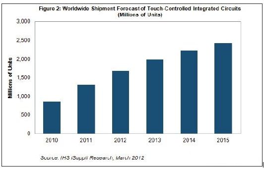 在苹果公司iPhone和iPad畅销的推动下,智能手机和媒体平板中的触控屏急剧增长,从而导致触摸控制器集成电路(IC)出货量在短短五年内将增长近两倍。