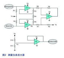 这个测量仪表放大器包含有两个级。最后一个级(亦即输出级)是一个差分放大器,它能够拒绝直流电平以及同时影响两个输入的干扰和噪声电压源。由两个放大器组成的第一级(亦即是输入级)则被配置成一个可将输入隔离的缓冲器。可是,基于放大器间的失配使它们彼此不能相互连接,所以要在两个放大器之间加装平衡电阻。将两个级的增益相乘便可得出测量仪表放大器的增益。理论上,共模抑制比(CMPR)应该是无限大,但由于出现电阻失配,导致输出级的非零共模增益非常小。在电路的输入级中,流经所有电阻的电流是一样的。这都有赖于LMP2234具有高输入阻抗和低输入偏置电流的特点?! ?br />