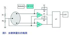 图5所示为一个完整方案的框图,该系统是由电池供电并可使用LM2623来提供3.3V的电源电压。通过电极量度出来的电流之后会经由一个运算放大器被转换成一个电压,这个电压再被送到微控制器处理,最后显示在LCD荧幕上。