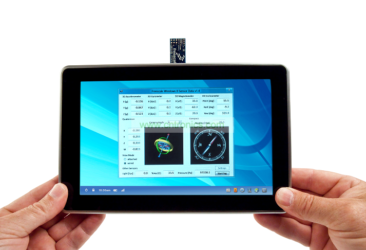 飞思卡尔12轴传感器平台包括 Xtrinsic MMA8451Q 3轴加速计、Xtrinsic MAG3110 3轴磁力计、Xtrinsic MPL3115A2精密高度计、压力和温度传感器以及一个模拟环境光传感器。它还提供多种兼容的陀螺仪可供选择。使飞思卡尔从竞争对手中脱颖而出的是另外 集成了飞思卡尔ColdFire+ MCF51JU128VHS微控制器。 ColdFire器件充当传感器枢纽,再加上飞思卡尔传感器融合软件,能高效地整合、配置和处理传感器数据,满足Windows 8操作系统的要求。参考平台注重待机功耗、整体功耗和成本效益,使用标准HID驱动器通过USB与PC主机进行通信。